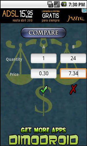 Comparador de precios es un aplicación que pone a disposición del usuario un mecanismo para que pueda comparar el precio de dos cantidades distintas del mismo producto para ver cual es más rentable: